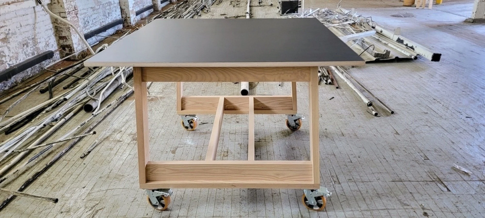 Built to work and last forever. This studio-height work bench pairs hand-selected solid ash legs with a 1" Baltic birch core wrapped in matte-black Fenix® laminate—soft-touch, anti-fingerprint, and surprisingly easy to clean. Locking casters roll smooth, then plant firm when it’s time to focus. Perfect for layout, finish work, laptops, and meetings on the move.